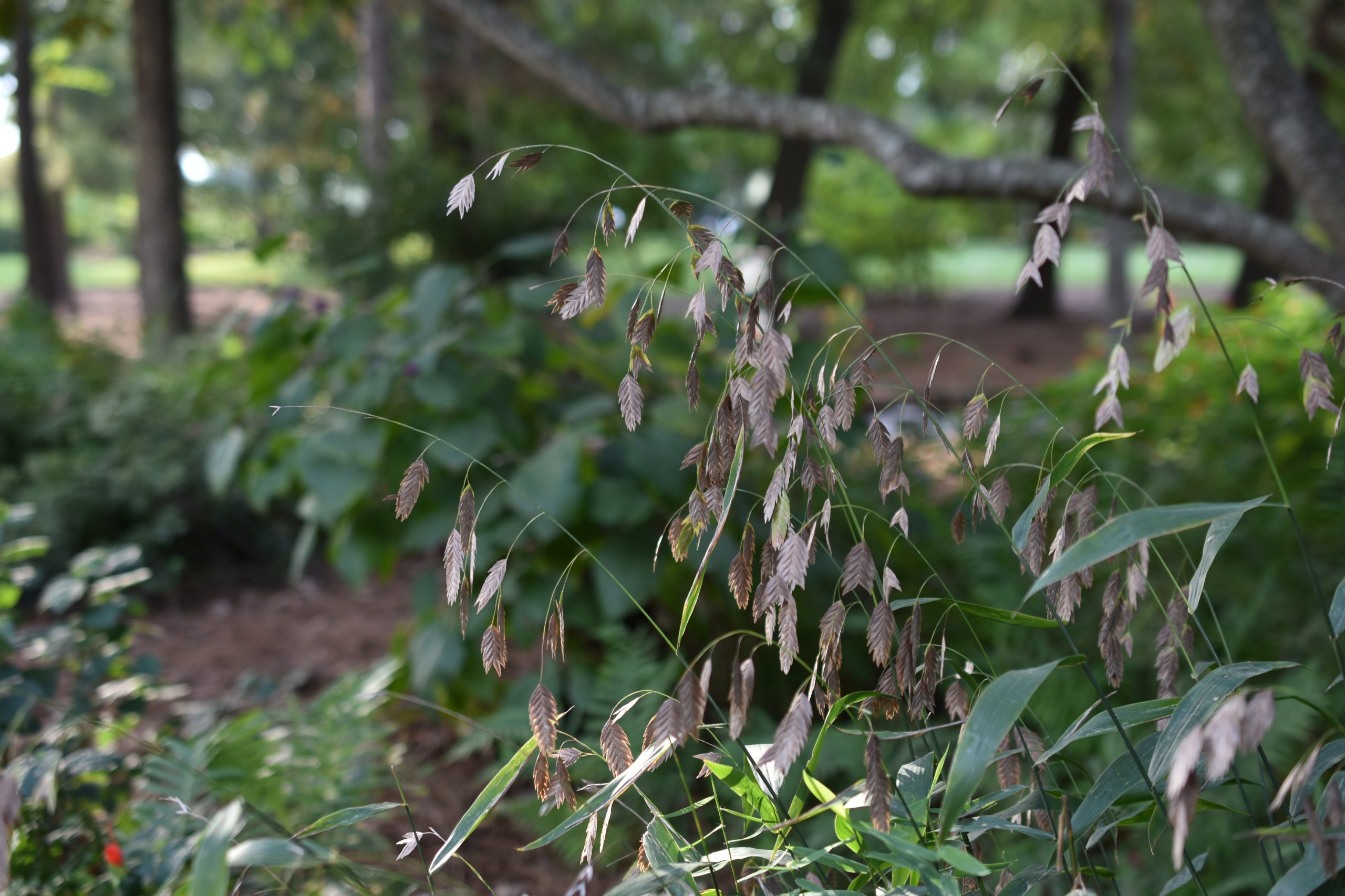 Inland Seaoats(Chasmanthium latifolium): Inland Seaoats are an attractive, dense-covering shade grass, distinguishable by its decorative seed heads. It turns from blue-green to ivory to soft brown throughout the year. This aggressive growing grass is highly useful for preventing soil erosion. Loved by butterflies and animals who eat the seeds, this grass can be found in the shadier habitat areas of the Commons and throughout Hermann Park.
