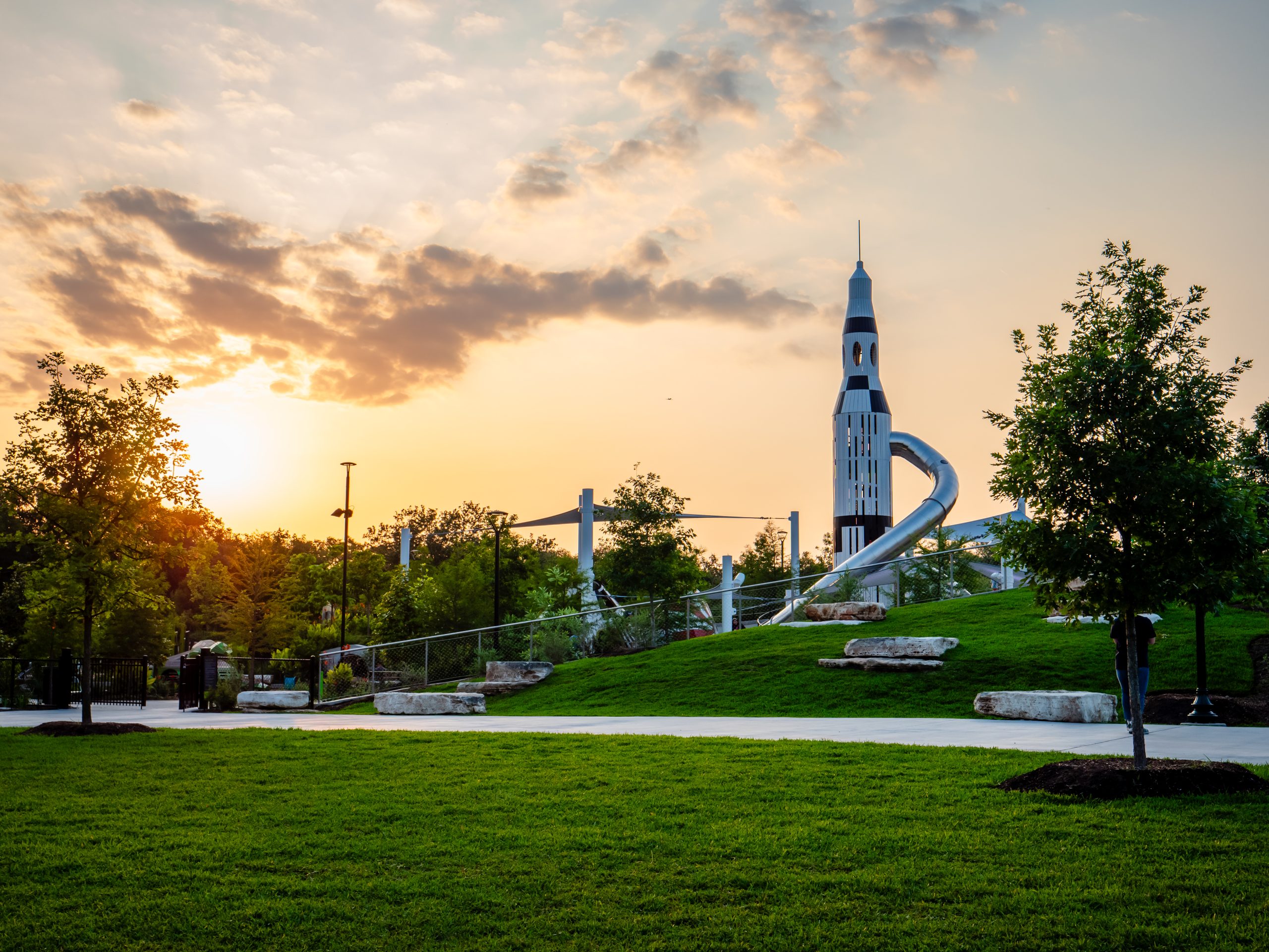 - The Space Adventure area with a 45-foot-tall Rocket Ship slide and a space capsule for climbing and imaginary play.
